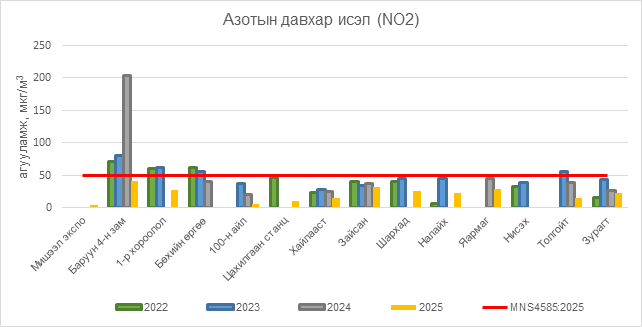 2025 оны 10 дугаар сарын 13-ны байдлаар азотын давхар исэл (NO2) нь бүх цэгүүдэд MNS 4585:2025 АЧС-аас даваагүй байна.