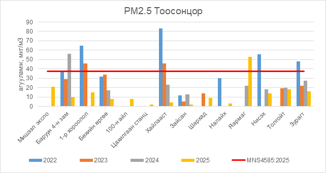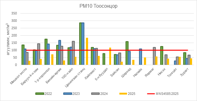 2025 оны 10 дугаар сарын 13-ны байдлаар РМ10 тоосонцор нь Цахилгаан станц орчим АЧС-аас 86 мкг/м3 –ээр их, 5-н буудал орчим АЧС-аас 19 мкг/м3 –ээр их, бусад цэгүүдэд MNS 4585:2025 АЧС-аас даваагүй байна.
