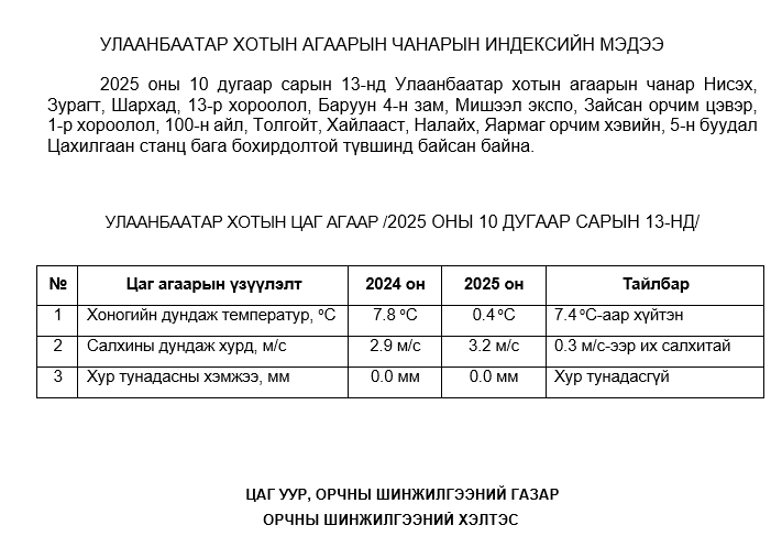 2025 оны 10 дугаар сарын 13-ны байдлаар РМ2.5 тоосонцор нь Яармаг орчим АЧС-аас 15.5 мкг/м3 –ээр их, бусад цэгүүдэд MNS 4585:2025 АЧС-аас даваагүй байна.