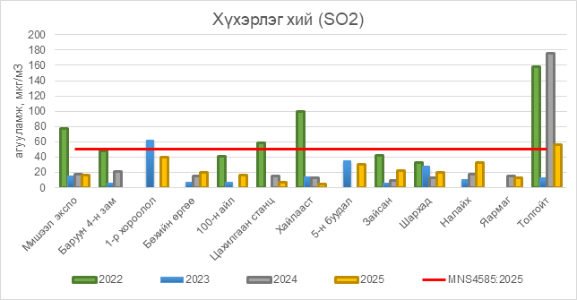 2025 оны 10 дугаар сарын 19-ний байдлаар хүхэрлэг хий (SO2) нь Толгойт орчим АЧС-аас 7 мкг/м3 –ээр их, бусад цэгүүдэд MNS 4585:2025 АЧС-аас даваагүй байна.