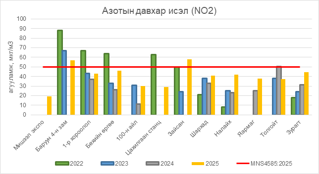 Азотын давхар исэл (NO2) нь Баруун 4-н зам орчим АЧС-аас 7 мкг/м3 –ээр их, Зайсан орчим АЧС-аас 8 мкг/м3 –ээр их, бусад цэгүүдэд MNS 4585:2025 АЧС-аас даваагүй байна.