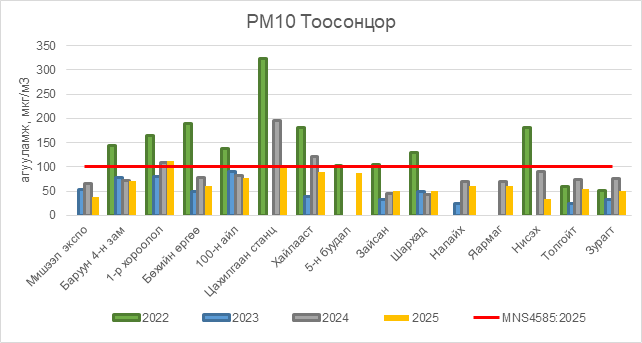 РМ10 тоосонцор нь 1-р хороолол орчим АЧС-аас 12 мкг/м3 –ээр их, бусад цэгүүдэд MNS 4585:2025 АЧС-аас даваагүй байна.