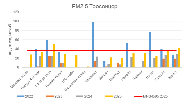 РМ2.5 тоосонцор нь 1-р хороолол орчим АЧС-аас 12.5 мкг/м3 –ээр их, Зурагт орчим АЧС-аас 5.5 мкг/м3 –ээр их, бусад цэгүүдэд MNS 4585:2025 АЧС-аас даваагүй байна.