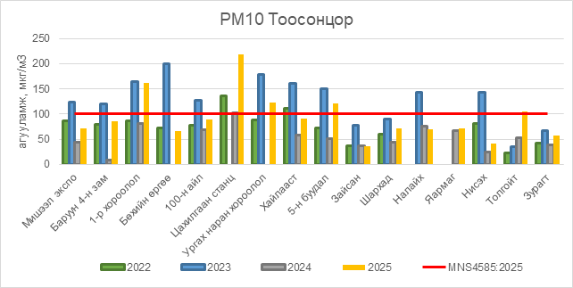 РМ10 тоосонцор нь 1-р хороолол орчим АЧС-аас 61 мкг/м3 –ээр их, Цахилгаан станц орчим АЧС-аас 118 мкг/м3 –ээр их, Ургах наран хороолол орчим АЧС-аас 22 мкг/м3 –ээр их, 5 буудал орчим АЧС-аас 21 мкг/м3 –ээр их, Толгойт орчим АЧС-аас 6 мкг/м3 –ээр их, бусад цэгүүдэд MNS 4585:2025 АЧС-аас даваагүй байна.