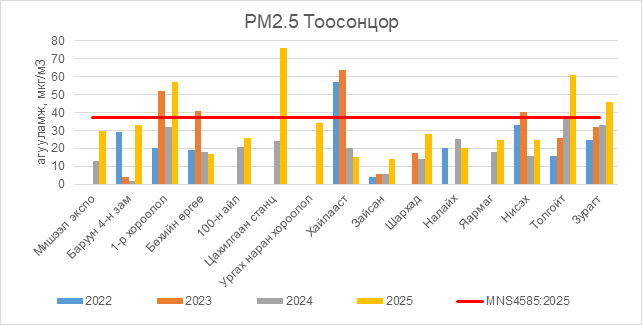 РМ2.5 тоосонцор нь 1-р хороолол орчим АЧС-аас 19.5 мкг/м3 –ээр их, Цахилгаан станц орчим АЧС-аас 38.5 мкг/м3 –ээр их, Толгойт орчим АЧС-аас 23.5 мкг/м3 –ээр их, Зурагт орчим АЧС-аас 8.5 мкг/м3 –ээр их, бусад цэгүүдэд MNS 4585:2025 АЧС-аас даваагүй байна.