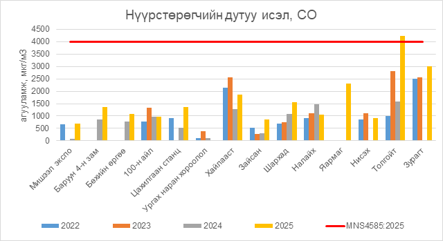 Нүүрстөрөгчийн дутуу исэл (СО) нь Толгойт орчим АЧС-аас 240 мкг/м3 –ээр их, бусад цэгүүдэд MNS 4585:2025 АЧС-аас даваагүй байна.