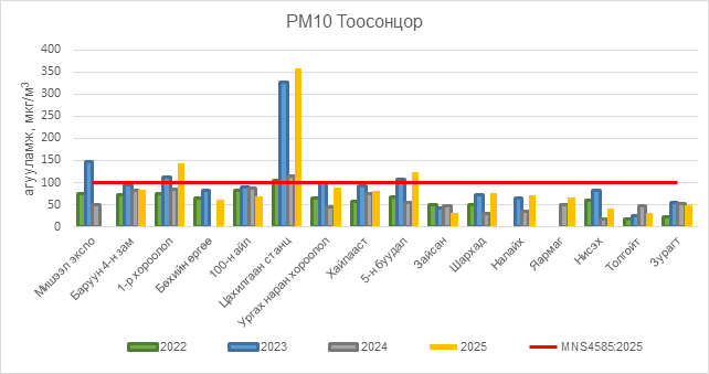 РМ10 тоосонцор нь 1-р хороолол орчим АЧС-аас 44 мкг/м3 –ээр их, Цахилгаан станц орчим АЧС-аас 259 мкг/м3 –ээр их, 5 буудал орчим АЧС-аас 23 мкг/м3 –ээр их, бусад цэгүүдэд MNS 4585:2025 АЧС-аас даваагүй байна.