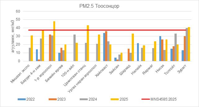 РМ2.5 тоосонцор нь 1-р хороолол орчим АЧС-аас 10.5 мкг/м3 –ээр их, Цахилгаан станц орчим АЧС-аас 5.5 мкг/м3 –ээр их, Зурагт орчим АЧС-аас 3.5 мкг/м3 –ээр их, бусад цэгүүдэд MNS 4585:2025 АЧС-аас даваагүй байна.