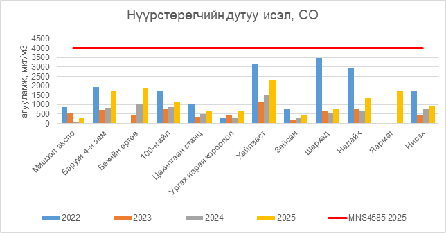 Нүүрстөрөгчийн дутуу исэл (СО) нь бүх цэгүүдэд MNS 4585:2025 АЧС-аас даваагүй байна.