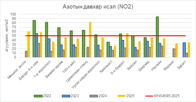 Азотын давхар исэл (NO2) нь Мишээл экспо орчим АЧС-аас 10 мкг/м3 –ээр их, Баруун 4-н зам орчим АЧС-аас 8 мкг/м3 –ээр их, Цахилгаан станц орчим АЧС-аас 32 мкг/м3 –ээр их, 5-н буудал орчим АЧС-аас 6 мкг/м3 –ээр их, бусад цэгүүдэд MNS 4585:2025 АЧС-аас даваагүй байна.