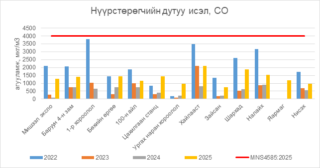 Нүүрстөрөгчийн дутуу исэл (СО) нь бүх цэгүүдэд MNS 4585:2025 АЧС-аас даваагүй байна.