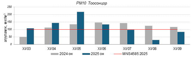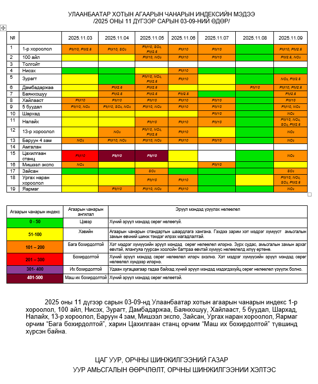 Улаанбаатар хотын агаарт түгээмэл бохирдуулах бодис хүхэрлэг хий /SO2/, азотын давхар исэл /NO2/, тоосонцор /PM10, PM2.5/, нүүрстөрөгчийн дутуу исэл /CO/, озон /O3/-ны агууламжийг тодорхойллоо.