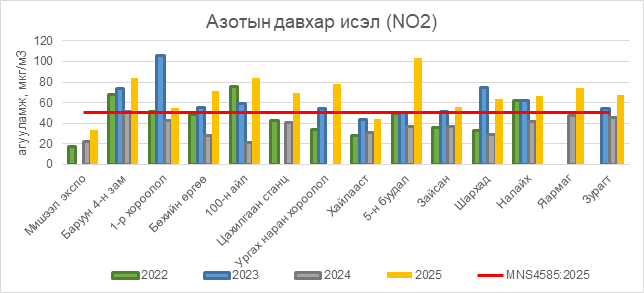 Азотын давхар исэл (NO2) нь Баруун 4-н зам орчим АЧС-аас 34 мкг/м3 –ээр их, 1-р хороолол орчим 5 мкг/м3 –ээр их, Бөхийн өргөө орчим АЧС-аас 21 мкг/м3 –ээр их, 100-н айл орчим АЧС-аас 34 мкг/м3 –ээр их, Цахилгаан станц орчим АЧС-аас 19 мкг/м3 –ээр их, Ургах наран хороолол орчим АЧС-аас 28 мкг/м3 –ээр их, 5-н буудал орчим АЧС-аас 53 мкг/м3 –ээр их, Зайсан орчим АЧС-аас 6 мкг/м3 –ээр их, Шархад орчим АЧС-аас 14 мкг/м3 –ээр их, Налайх орчим АЧС-аас 16 мкг/м3 –ээр их, Яармаг орчим АЧС-аас 24 мкг/м3 –ээр их, Зурагт орчим АЧС-аас 17 мкг/м3 –ээр их, бусад цэгүүдэд MNS 4585:2025 АЧС-аас даваагүй байна.