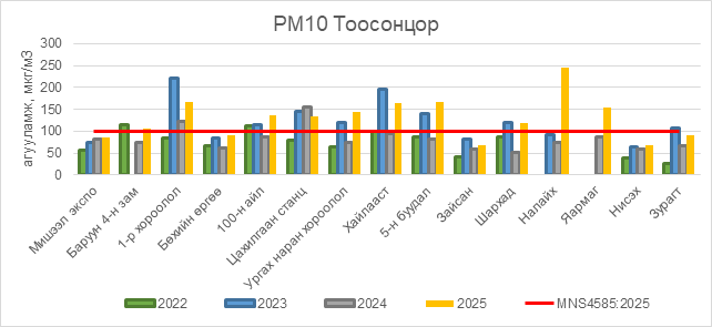 РМ10 тоосонцор нь Баруун 4-н зам орчим АЧС-аас 5 мкг/м3 –ээр их, 1-р хороолол орчим АЧС-аас 68 мкг/м3 –ээр их, 100-н айл орчим АЧС-аас 37 мкг/м3 –ээр их, Цахилгаан станц орчим АЧС-аас 34 мкг/м3 –ээр их, Ургах наран хороолол орчим АЧС-аас 44 мкг/м3 –ээр их, Хайлааст орчим АЧС-аас 63 мкг/м3 –ээр их, 5-н буудал орчим АЧС-аас 66 мкг/м3 –ээр их, Шархад орчим АЧС-аас 20 мкг/м3 –ээр их, Налайх орчим АЧС-аас 145 мкг/м3 –ээр их, Яармаг орчим АЧС-аас 55 мкг/м3 –ээр их, бусад цэгүүдэд MNS 4585:2025 АЧС-аас даваагүй байна.