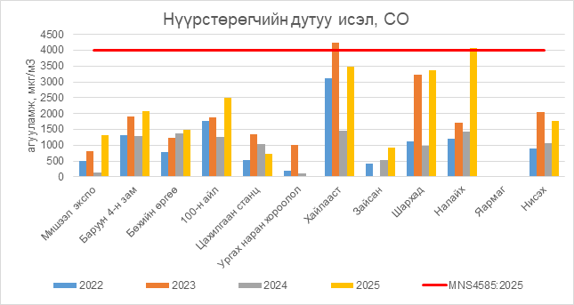 Нүүрстөрөгчийн дутуу исэл (СО) нь Налайх орчим АЧС-аас 74 мкг/м3 –ээр их, бусад цэгүүдэд MNS 4585:2025 АЧС-аас даваагүй байна.
