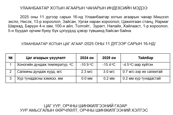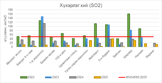 2025 оны 11 дүгээр сарын 16-ны байдлаар хүхэрлэг хий (SO2) нь бүх цэгүүдэд MNS 4585:2025 АЧС-аас даваагүй байна.