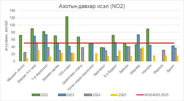 Азотын давхар исэл (NO2) нь бүх цэгүүдэд MNS 4585:2025 АЧС-аас даваагүй байна.