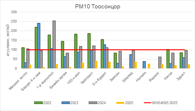 РМ10 тоосонцор нь бүх цэгүүдэд MNS 4585:2025 АЧС-аас даваагүй байна.