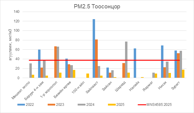 РМ2.5 тоосонцор нь бүх цэгүүдэд MNS 4585:2025 АЧС-аас даваагүй байна.