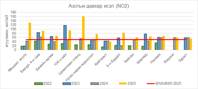 Азотын давхар исэл (NO2) нь Мишээл экспо орчим АЧС-аас 81 мкг/м3 –ээр их, Баруун 4-н зам орчим АЧС-аас 41 мкг/м3 –ээр их, Бөхийн өргөө орчим АЧС-аас 18 мкг/м3 –ээр их, 100-н айл орчим АЧС-аас 44 мкг/м3 –ээр их, Цахилгаан станц орчим АЧС-аас 112 мкг/м3 –ээр их, Ургах наран хороолол орчим АЧС-аас 26 мкг/м3 –ээр их, 5-н буудал орчим АЧС-аас 33 мкг/м3 –ээр их, Зайсан орчим АЧС-аас 10 мкг/м3 –ээр их, Шархад орчим АЧС-аас 15 мкг/м3 –ээр их, Налайх орчим АЧС-аас 18 мкг/м3 –ээр их, Яармаг орчим АЧС-аас 8 мкг/м3 –ээр их, Зурагт орчим АЧС-аас 4 мкг/м3 –ээр их байна. бусад цэгүүдэд MNS 4585:2025 АЧС-аас даваагүй байна.