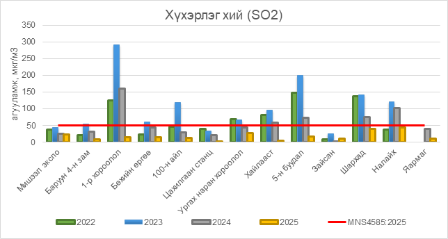 2025 оны 11 дүгээр сарын 30-ны байдлаар хүхэрлэг хий (SO2) нь бүх цэгүүдэд MNS 4585:2025 АЧС-аас даваагүй байна.