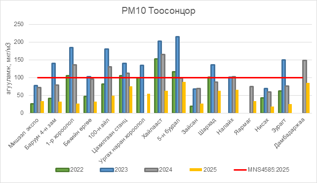 РМ10 тоосонцор нь бүх цэгүүдэд MNS 4585:2025 АЧС-аас даваагүй байна.