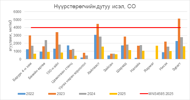 Нүүрстөрөгчийн дутуу исэл (СО) нь бүх цэгүүдэд MNS 4585:2025 АЧС-аас даваагүй байна.