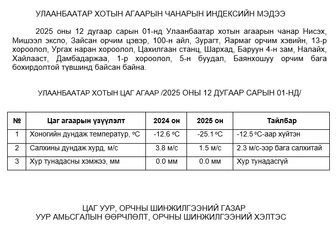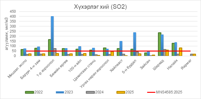 2025 оны 12 дугаар сарын 01-ний байдлаар хүхэрлэг хий (SO2) нь Шархад орчим АЧС-аас 10 мкг/м3 –ээр их, Налайх орчим АЧС-аас 32 мкг/м3 –ээр их, бусад цэгүүдэд MNS 4585:2025 АЧС-аас даваагүй байна.