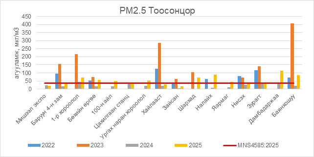 РМ2.5 тоосонцор нь Баруун 4-н зам орчим АЧС-аас 4.5 мкг/м3 –ээр их, 1-р хороолол орчим АЧС-аас 33.5 мкг/м3 –ээр их, Бөхийн өргөө орчим АЧС-аас 17.5 мкг/м3 –ээр их, 100-н айл орчим АЧС-аас 12.5 мкг/м3 –ээр их, Цахилгаан станц орчим АЧС-аас 2.5 мкг/м3 –ээр их, Шархад орчим АЧС-аас 23.5 мкг/м3 –ээр их, Налайх орчим АЧС-аас 53.5 мкг/м3 –ээр их, Яармаг орчим АЧС-аас 5.5 мкг/м3 –ээр их, Дамбадаржаа орчим АЧС-аас 76.5 мкг/м3 –ээр их, Баянхошуу орчим АЧС-аас 50.5 мкг/м3 –ээр их, бусад цэгүүдэд MNS 4585:2025 АЧС-аас даваагүй байна.