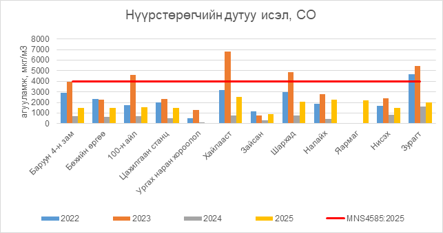 Нүүрстөрөгчийн дутуу исэл (СО) нь бүх цэгүүдэд MNS 4585:2025 АЧС-аас даваагүй байна.