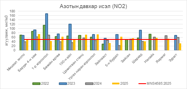 Азотын давхар исэл (NO2) нь Баруун 4-н зам орчим АЧС-аас 25 мкг/м3 –ээр их, Бөхийн өргөө орчим АЧС-аас 13 мкг/м3 –ээр их, 100-н айл орчим АЧС-аас 2 мкг/м3 –ээр их, Цахилгаан станц орчим АЧС-аас 22 мкг/м3 –ээр их, Ургах наран хороолол орчим АЧС-аас 23 мкг/м3 –ээр их, 5-н буудал орчим АЧС-аас 13 мкг/м3 –ээр их, Зайсан орчим АЧС-аас 6 мкг/м3 –ээр их, Налайх орчим АЧС-аас 8 мкг/м3 –ээр их, Яармаг орчим АЧС-аас 3 мкг/м3 –ээр их, бусад цэгүүдэд MNS 4585:2025 АЧС-аас даваагүй байна.