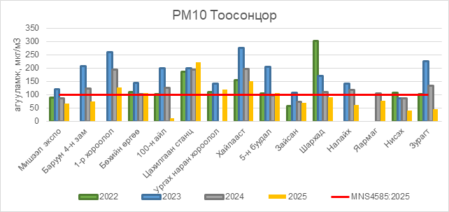РМ10 тоосонцор нь 1-р хороолол орчим АЧС-аас 27 мкг/м3 –ээр их, Бөхийн өргөө орчим АЧС-аас 7 мкг/м3 –ээр их, Цахилгаан станц орчим АЧС-аас 123 мкг/м3 –ээр их, Ургах наран хороолол орчим АЧС-аас 19 мкг/м3 –ээр их, Хайлааст орчим АЧС-аас 51 мкг/м3 –ээр их, 5-н буудал орчим АЧС-аас 7 мкг/м3 –ээр их, бусад цэгүүдэд MNS 4585:2025 АЧС-аас даваагүй байна.