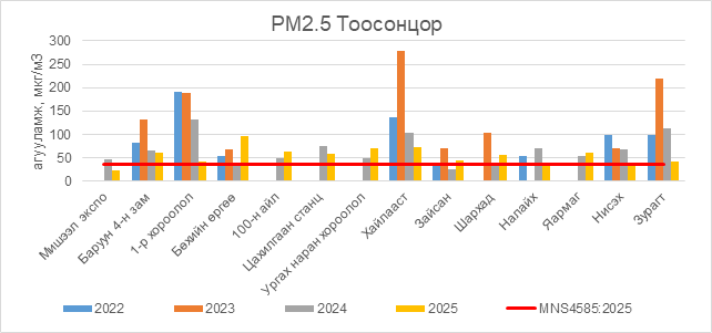 РМ2.5 тоосонцор нь Баруун 4-н зам орчим АЧС-аас 23.5 мкг/м3 –ээр их, 1-р хороолол орчим АЧС-аас 4.5 мкг/м3 –ээр их, Бөхийн өргөө орчим АЧС-аас 58.5 мкг/м3 –ээр их, 100-н айл орчим АЧС-аас 26.5 мкг/м3 –ээр их, Цахилгаан станц орчим АЧС-аас 21.5 мкг/м3 –ээр их, Ургах наран хороолол орчим АЧС-аас 32.5 мкг/м3 –ээр их, Хайлааст орчим АЧС-аас 36.5 мкг/м3 –ээр их, Шархад орчим АЧС-аас 18.5 мкг/м3 –ээр их, Налайх орчим АЧС-аас 3.5 мкг/м3 –ээр их, Яармаг орчим АЧС-аас 22.5 мкг/м3 –ээр их, Зурагт орчим АЧС-аас 4.5 мкг/м3 –ээр их байна.