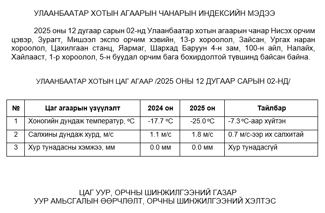 2025 оны 12 дугаар сарын 02-ны байдлаар хүхэрлэг хий (SO2) нь Бөхийн өргөө орчим АЧС-аас 4 мкг/м3 –ээр их, Ургах наран хороолол орчим АЧС-аас 11 мкг/м3 –ээр их, Шархад орчим АЧС-аас 10 мкг/м3 –ээр их, Налайх орчим АЧС-аас 10 мкг/м3 –ээр их, бусад цэгүүдэд MNS 4585:2025 АЧС-аас даваагүй байна.