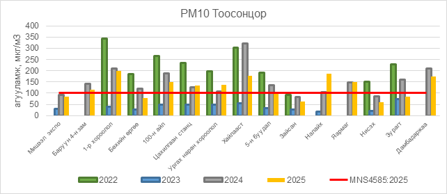 РМ10 тоосонцор нь Баруун 4-н зам орчим АЧС-аас 16 мкг/м3 –ээр их, 1-р хороолол орчим АЧС-аас 100 мкг/м3 –ээр их, 100-н айл орчим АЧС-аас 48 мкг/м3 –ээр их, Цахилгаан станц орчим АЧС-аас 35 мкг/м3 –ээр их, Ургах наран хороолол орчим АЧС-аас 38 мкг/м3 –ээр их, Хайлааст орчим АЧС-аас 78 мкг/м3 –ээр их, 5-н буудал орчим АЧС-аас 5 мкг/м3 –ээр их, Налайх орчим АЧС-аас 88 мкг/м3 –ээр их, Яармаг орчим АЧС-аас 49 мкг/м3 –ээр их, Дамбадаржаа орчим АЧС-аас 74 мкг/м3 –ээр их, бусад цэгүүдэд MNS 4585:2025 АЧС-аас даваагүй байна.