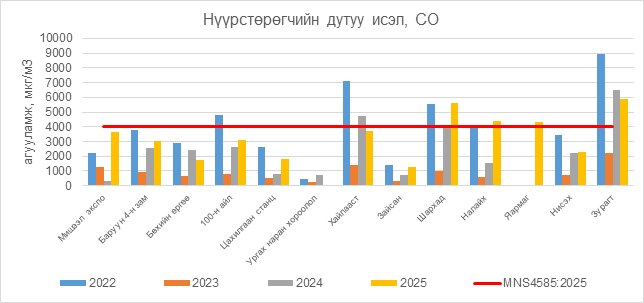 Нүүрстөрөгчийн дутуу исэл (СО) нь Шархад орчим АЧС-аас 1593 мкг/м3 –ээр их, Налайх орчим АЧС-аас 398 мкг/м3 –ээр их, Яармаг орчим АЧС-аас 300 мкг/м3 –ээр их, Зурагт орчим АЧС-аас 1921 мкг/м3 –ээр их, бусад цэгүүдэд MNS 4585:2025 АЧС-аас даваагүй байна.