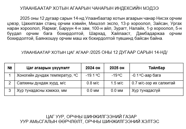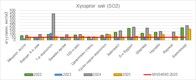 2025 оны 12 дугаар сарын 14-ний байдлаар хүхэрлэг хий (SO2) нь Мишээл экспо орчим АЧС-аас 3 мкг/м3 –ээр их, 1-р хороолол орчим 9 мкг/м3 –ээр их, 100-н айл орчим АЧС-аас 17 мкг/м3 –ээр их, Ургах наран хороолол орчим АЧС-аас 39 мкг/м3 –ээр их, 5-н буудал орчим АЧС-аас 15 мкг/м3 –ээр их, Шархад орчим АЧС-аас 42 мкг/м3 –ээр их, Налайх орчим АЧС-аас 41 мкг/м3 –ээр их, Яармаг орчим АЧС-аас 9 мкг/м3 –ээр их, Баянхошуу орчим АЧС-аас 153 мкг/м3 –ээр их, бусад цэгүүдэд MNS 4585:2025 АЧС-аас даваагүй байна.