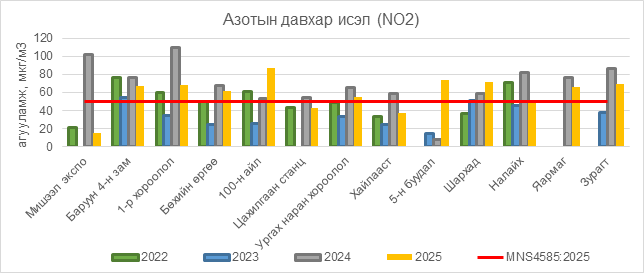 Азотын давхар исэл (NO2) нь Баруун 4-н зам орчим АЧС-аас 17 мкг/м3 –ээр их, 1-р хороолол орчим 18 мкг/м3 –ээр их, Бөхийн өргөө орчим АЧС-аас 12 мкг/м3 –ээр их, 100-н айл орчим АЧС-аас 37 мкг/м3 –ээр их, Ургах наран хороолол орчим АЧС-аас 5 мкг/м3 –ээр их, 5-н буудал орчим АЧС-аас 24 мкг/м3 –ээр их, Шархад орчим АЧС-аас 22 мкг/м3 –ээр их, Яармаг орчим АЧС-аас 16 мкг/м3 –ээр их, Зурагт орчим АЧС-аас 19 мкг/м3 –ээр их, бусад цэгүүдэд MNS 4585:2025 АЧС-аас даваагүй байна.