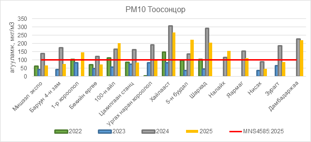 РМ10 тоосонцор нь 1-р хороолол орчим АЧС-аас 48 мкг/м3 –ээр их, 100-н айл орчим АЧС-аас 103 мкг/м3 –ээр их, Хайлааст орчим АЧС-аас 166 мкг/м3 –ээр их, 5-н буудал орчим АЧС-аас 125 мкг/м3 –ээр их, Шархад орчим АЧС-аас 105 мкг/м3 –ээр их, Налайх орчим АЧС-аас 56 мкг/м3 –ээр их, Яармаг орчим АЧС-аас 11 мкг/м3 –ээр их, Дамбадаржаа орчим АЧС-аас 120 мкг/м3 –ээр их, бусад цэгүүдэд MNS 4585:2025 АЧС-аас даваагүй байна.
