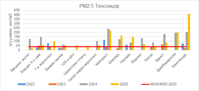 РМ2.5 тоосонцор нь Баруун 4-н зам орчим АЧС-аас 19.5 мкг/м3 –ээр их, 1-р хороолол орчим АЧС-аас 61.5 мкг/м3 –ээр их, Бөхийн өргөө орчим АЧС-аас 14.5 мкг/м3 –ээр их, 100-н айл орчим АЧС-аас 20.5 мкг/м3 –ээр их, Цахилгаан станц орчим АЧС-аас 5.5 мкг/м3 –ээр их, Ургах наран хороолол орчим АЧС-аас 10.5 мкг/м3 –ээр их, Хайлааст орчим АЧС-аас 182.5 мкг/м3 –ээр их, Шархад орчим АЧС-аас 127.5 мкг/м3 –ээр их, Налайх орчим АЧС-аас 110.5 мкг/м3 –ээр их, Яармаг орчим АЧС-аас 29.5 мкг/м3 –ээр их, Зурагт орчим АЧС-аас 46.5 мкг/м3 –ээр их, Дамбадаржаа орчим АЧС-аас 162.5 мкг/м3 –ээр их, Баянхошуу орчим АЧС-аас 372.5 мкг/м3 –ээр их байна.