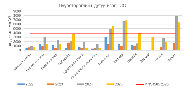 Нүүрстөрөгчийн дутуу исэл (СО) нь Хайлааст орчим АЧС-аас 1584 мкг/м3 –ээр их, Шархад орчим АЧС-аас 2865 мкг/м3 –ээр их, Зурагт орчим АЧС-аас 2399 мкг/м3 –ээр их, бусад цэгүүдэд MNS 4585:2025 АЧС-аас даваагүй байна.