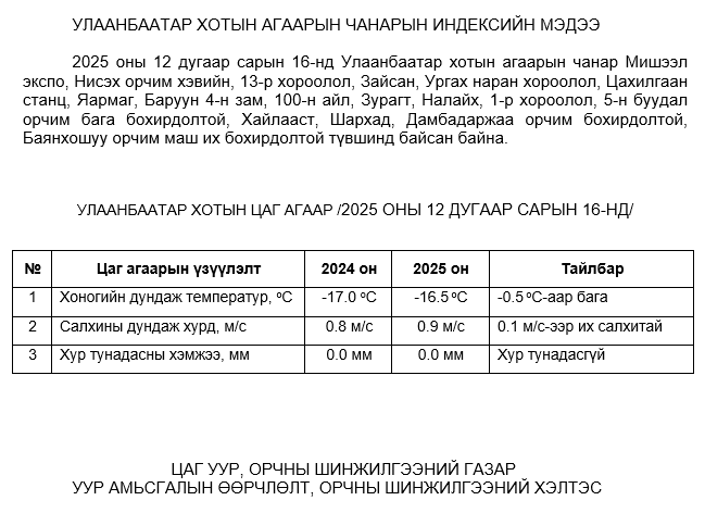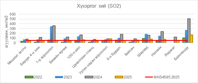 2025 оны 12 дугаар сарын 16-ны байдлаар хүхэрлэг хий (SO2) нь 100-н айл орчим АЧС-аас 14 мкг/м3 –ээр их, Ургах наран хороолол орчим АЧС-аас 33 мкг/м3 –ээр их, 5-н буудал орчим АЧС-аас 1 мкг/м3 –ээр их, Зайсан орчим АЧС-аас 11 мкг/м3 –ээр их, Шархад орчим АЧС-аас 27 мкг/м3 –ээр их, Налайх орчим АЧС-аас 22 мкг/м3 –ээр их, Баянхошуу орчим АЧС-аас 118 мкг/м3 –ээр их, бусад цэгүүдэд MNS 4585:2025 АЧС-аас даваагүй байна.