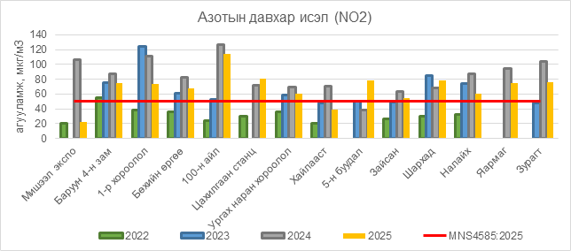Азотын давхар исэл (NO2) нь Баруун 4-н зам орчим АЧС-аас 25 мкг/м3 –ээр их, 1-р хороолол орчим 24 мкг/м3 –ээр их, Бөхийн өргөө орчим АЧС-аас 18 мкг/м3 –ээр их, 100-н айл орчим АЧС-аас 64 мкг/м3 –ээр их, Цахилгаан станц орчим АЧС-аас 31 мкг/м3 –ээр их, Ургах наран хороолол орчим АЧС-аас 11 мкг/м3 –ээр их, 5-н буудал орчим АЧС-аас 28 мкг/м3 –ээр их, Зайсан орчим АЧС-аас 5 мкг/м3 –ээр их, Шархад орчим АЧС-аас 29 мкг/м3 –ээр их, Налайх орчим АЧС-аас 10 мкг/м3 –ээр их, Яармаг орчим АЧС-аас 25 мкг/м3 –ээр их, Зурагт орчим АЧС-аас 16 мкг/м3 –ээр их байна.