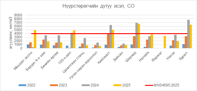 Нүүрстөрөгчийн дутуу исэл (СО) нь Мишээл экспо орчим АЧС-аас 947 мкг/м3 –ээр их, 100-н айл орчим АЧС-аас 836 мкг/м3 –ээр их, Хайлааст орчим АЧС-аас 1027 мкг/м3 –ээр их, Шархад орчим АЧС-аас 2660 мкг/м3 –ээр их, Зурагт орчим АЧС-аас 2398 мкг/м3 –ээр их, бусад цэгүүдэд MNS 4585:2025 АЧС-аас даваагүй байна.