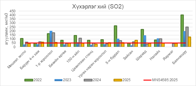 2025 оны 12 дугаар сарын 18-ны байдлаар хүхэрлэг хий (SO2) нь Баруун 4-н зам орчим АЧС-аас 10 мкг/м3 –ээр их, 1-р хороолол орчим 6 мкг/м3 –ээр их, Ургах наран хороолол орчим АЧС-аас 2 мкг/м3 –ээр их, 5-н буудал орчим АЧС-аас 3 мкг/м3 –ээр их, Зайсан орчим АЧС-аас 33 мкг/м3 –ээр их, Баянхошуу орчим АЧС-аас 75 мкг/м3 –ээр их, бусад цэгүүдэд MNS 4585:2025 АЧС-аас даваагүй байна.