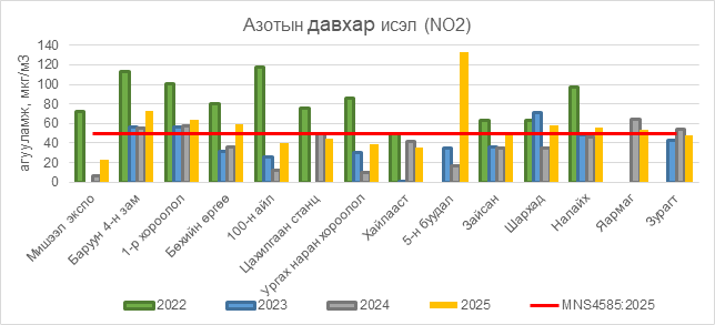 Азотын давхар исэл (NO2) нь Баруун 4-н зам орчим АЧС-аас 23 мкг/м3 –ээр их, 1-р хороолол орчим 14 мкг/м3 –ээр их, Бөхийн өргөө орчим АЧС-аас 9 мкг/м3 –ээр их, 5-н буудал орчим АЧС-аас 83 мкг/м3 –ээр их, Зайсан орчим АЧС-аас 1 мкг/м3 –ээр их, Шархад орчим АЧС-аас 8 мкг/м3 –ээр их, Налайх орчим АЧС-аас 6 мкг/м3 –ээр их, Яармаг орчим АЧС-аас 4 мкг/м3 –ээр их, бусад цэгүүдэд MNS 4585:2025 АЧС-аас даваагүй байна.
