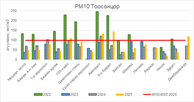 РМ10 тоосонцор нь 100-н айл орчим АЧС-аас 10 мкг/м3 –ээр их, Хайлааст орчим АЧС-аас 32 мкг/м3 –ээр их, 5-н буудал орчим АЧС-аас 44 мкг/м3 –ээр их, Дамбадаржаа орчим АЧС-аас 20 мкг/м3 –ээр их, бусад цэгүүдэд MNS 4585:2025 АЧС-аас даваагүй байна.