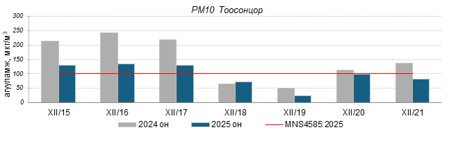 Улаанбаатар хотын агаарт түгээмэл бохирдуулах бодис хүхэрлэг хий /SO2/, азотын давхар исэл /NO2/, тоосонцор /PM10, PM2.5/, нүүрстөрөгчийн дутуу исэл /CO/, озон /O3/-ны агууламжийг тодорхойллоо.