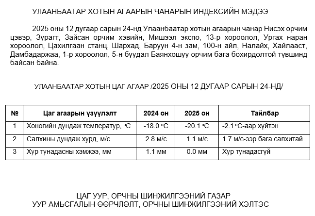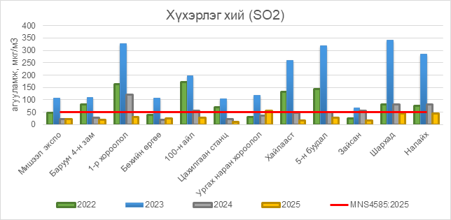2025 оны 12 дугаар сарын 24-ний байдлаар хүхэрлэг хий (SO2) нь Ургах наран хороолол орчим АЧС-аас 7 мкг/м3 –ээр их, Баянхошуу орчим АЧС-аас 1 мкг/м3 –ээр их, бусад цэгүүдэд MNS 4585:2025 АЧС-аас даваагүй байна.