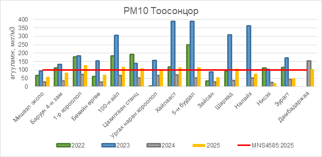 РМ10 тоосонцор нь 1-р хороолол орчим АЧС-аас 29 мкг/м3 –ээр их, 100-н айл орчим АЧС-аас 18 мкг/м3 –ээр их, Цахилгаан станц орчим АЧС-аас 10 мкг/м3 –ээр их, Хайлааст орчим АЧС-аас 15 мкг/м3 –ээр их, 5-н буудал орчим АЧС-аас 17 мкг/м3 –ээр их, Шархад орчим АЧС-аас 7 мкг/м3 –ээр их, Дамбадаржаа орчим АЧС-аас 5 мкг/м3 –ээр их, бусад цэгүүдэд MNS 4585:2025 АЧС-аас даваагүй байна.